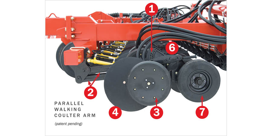 Посівний комплекс Bourgault 3710 має посилену міцну раму , яка тримається на тандемних колесах спереду і ззаду. Дискові сошники , які встановлені на рамі за допомогою параллелограмной кріплення , копіюють грунт незалежно один від одного. Тут також впроваджено цікаве рішення , яке дозволяє зберігати задану глибину при наїзді на різні нерівності грунту. Це балансуючий міст між копиюючими та прикочуючим колесом на сошниках . При наїзді того чи іншого колеса на скупчення пожнивних залишків або грудки грунту , посівні дисик не виглибляються .Ці паралельні важелі також дозволяють зберігати кут атаки насінявиводів сошників постійним , а значить і глибину.
