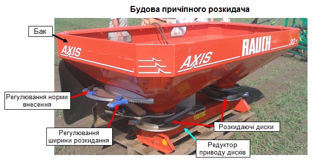 1) Вал відбору потужності трактора через карданний вал обертає диски із розкидаючими лопатками. Кожен диск розкидає добрива на свою площу.