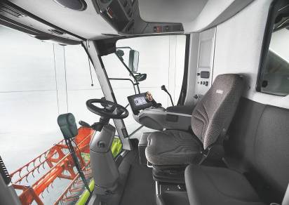Сучасна кабіна VISTA CAB з водійським місцем на пневмопідвісці і зручним пасажирським місцем не дозволяє втомлюватися протягом довгого трудового дня. Комфорт їзди і управління забезпечує багатофункціональний важіль , який легко передає всі команди водія: швидкість руху , напрямок руху , налаштування жниварки і мотовила , вимикання жниварки і VARIO столу , управління вивантажним шнеком і розвантаженням бункера . Крім того , через оглядове вікно в задній стінці кабіни зручно спостерігати за якістю зерна в бункері. Для роботи в темний час доби внутрішній простір бункера і колосового шнека освітлюється.